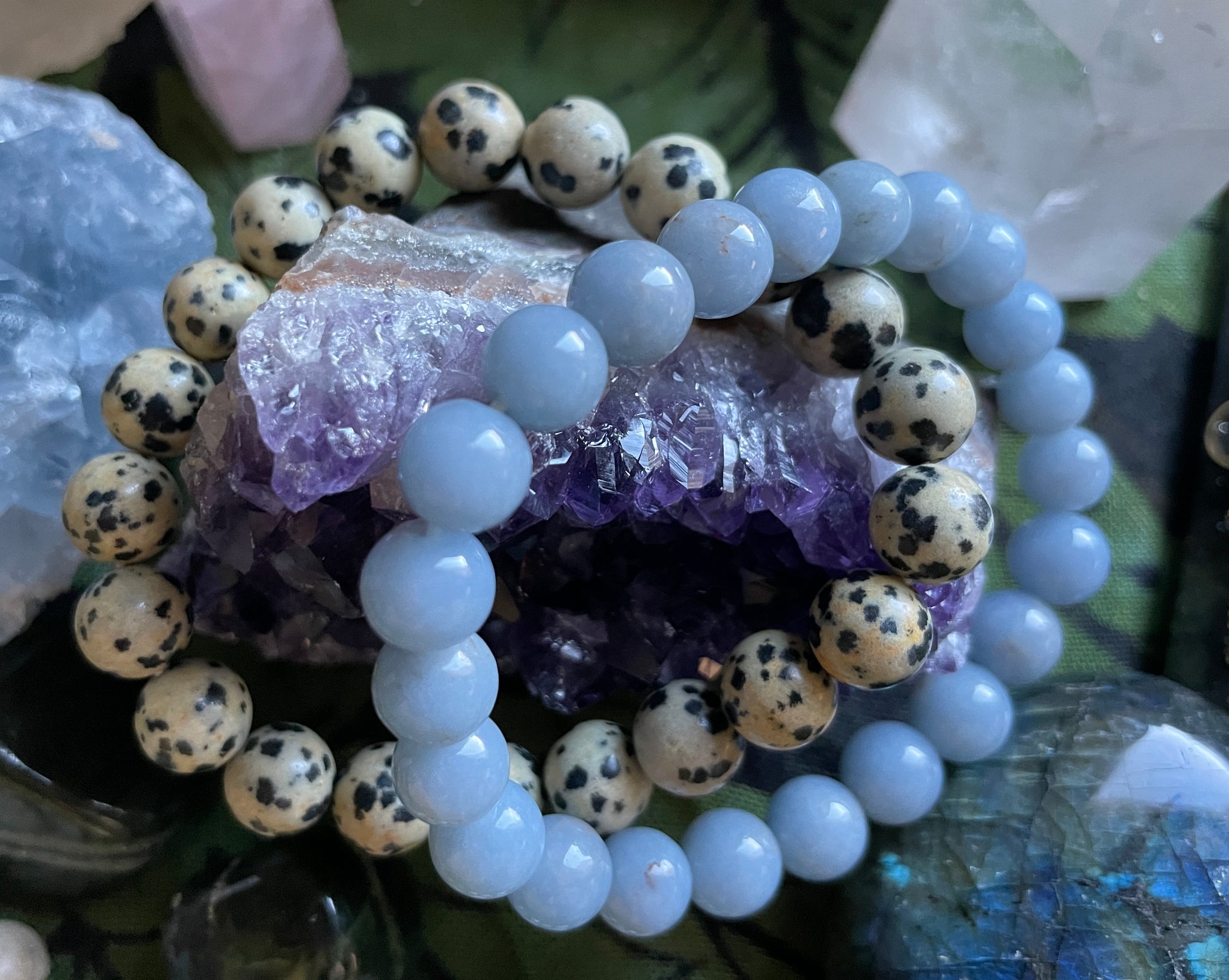 Angelite- "angel" stone, calming, soothing, lessened anxiety, associated with the throat chakra