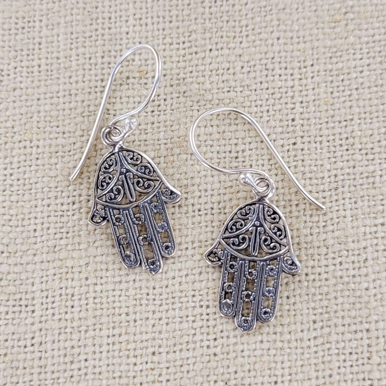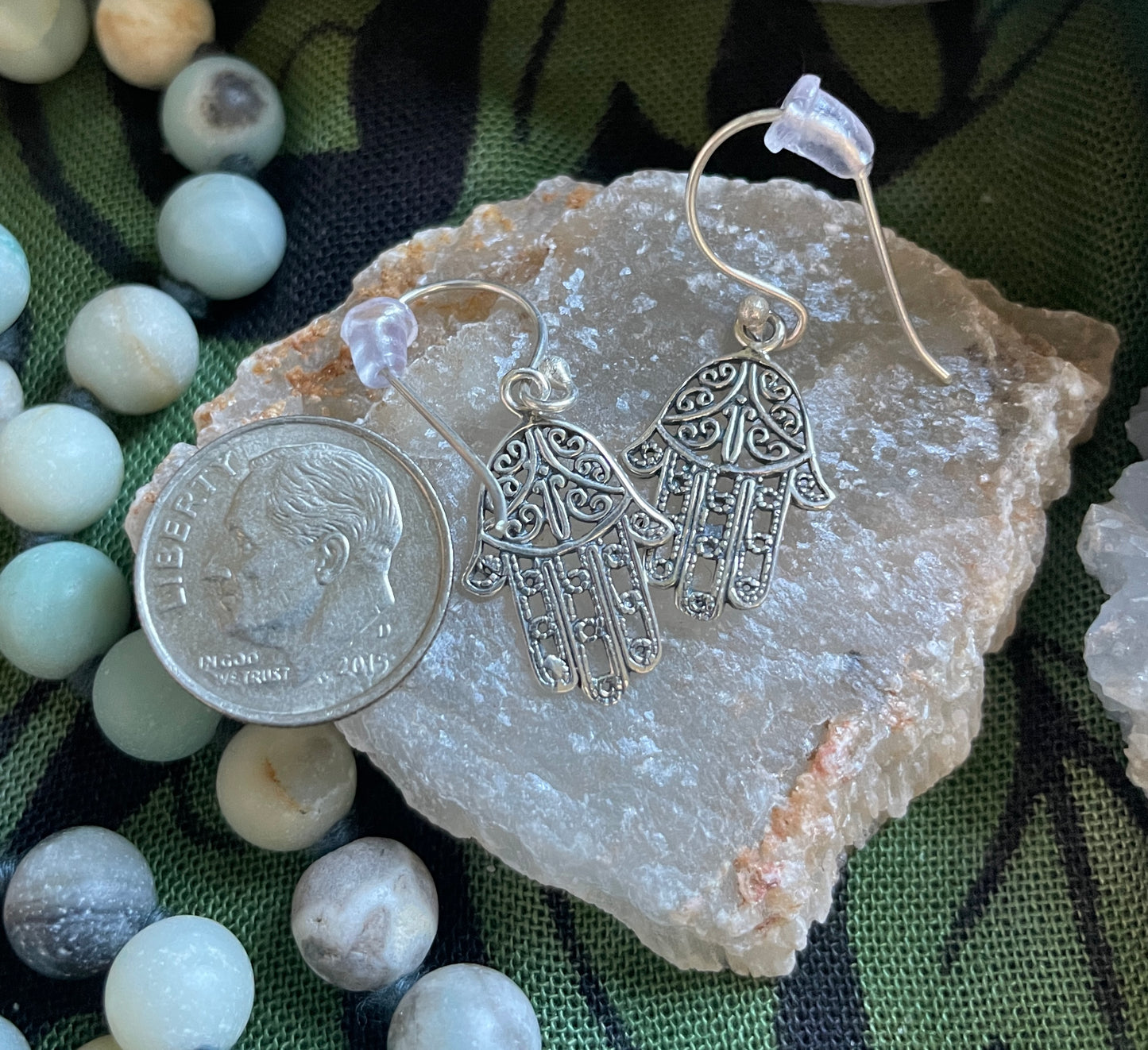 These sterling silver earrings have a filigree Hamsa design, hanging from a French wire. The earrings measure about 1 inch long including the wire and a half inch at its widest point. The Hamsa Hand is an ancient Middle Eastern talisman. It is a protective symbol believed to protect the wearer from harm against the evil eye and bring them abundance, fertility, good luck and good health.